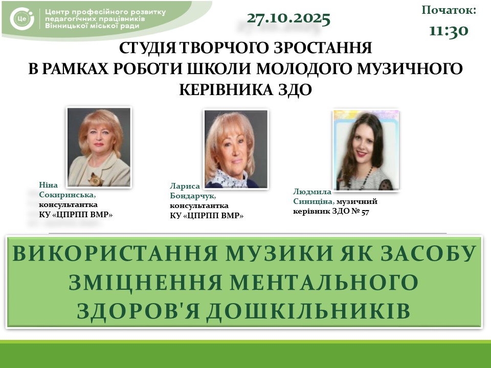 Студія творчого зростання: «Використання музики як засобу зміцнення ментального здоров’я дошкільників» ( в рамках роботи школи молодого музичного керівника)..